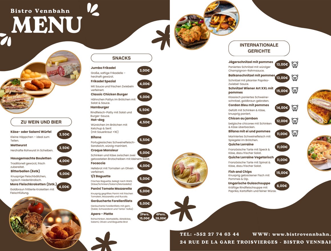 Im Bistro Terrasse „Vennbahn“ erwartet Sie eine leckere Auswahl an Snacks, Burgern, Baguettes, Paninis, Fish & Chips, Schnitzelgerichten, Quiches und weiteren internationalen Spezialitäten. Wir legen Wert auf gute Qualität, frische Zubereitung und herzhaften Geschmack.